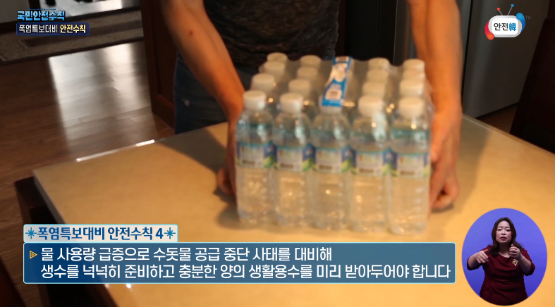 - 물 부족 대비: 생수 비축, 욕조에 생활용수 저장