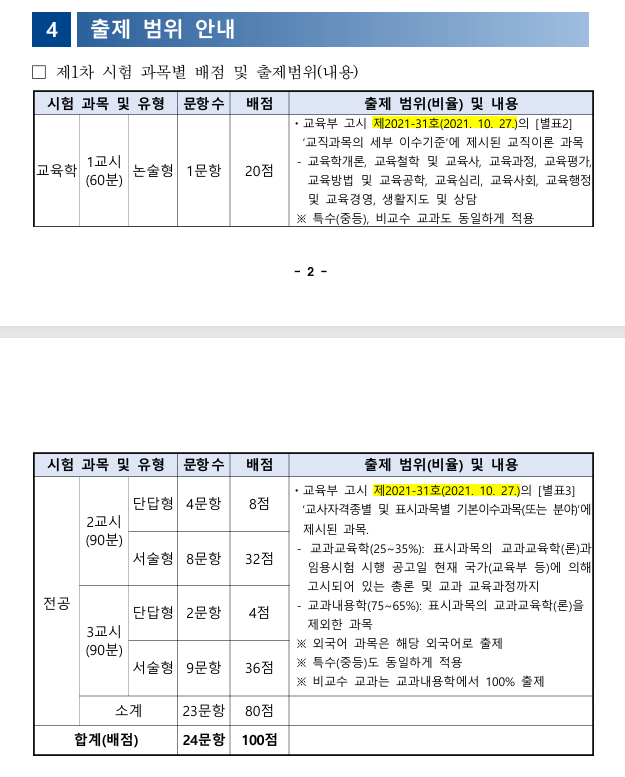 2교시 | 단답형 4문항, 서술형 8문항 | 40점 | 교과교육학 25~35%, 교과내용학 65~75% (비교수 교과 100% 내용학) |