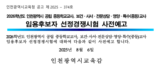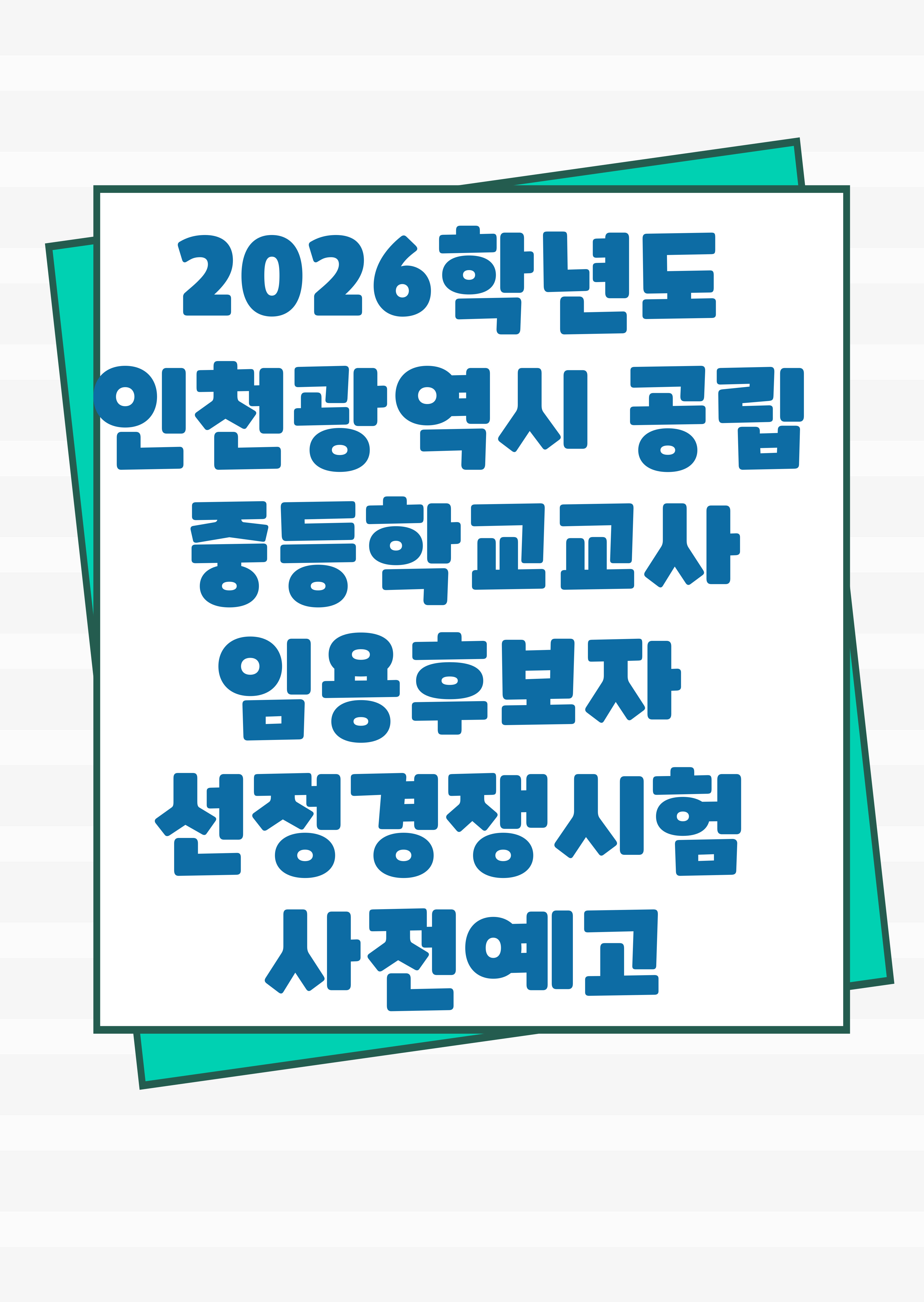 인천광역시교육청에서 발표한 2026학년도 공립 중등교사 임용시험 사전예고가 2025년 8월 6일자로 공고되었습니다.