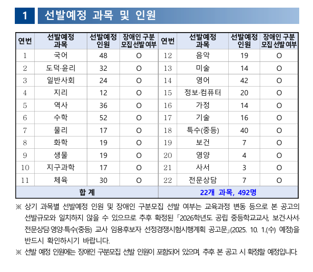 이번 시험에서는 중등교사뿐만 아니라 보건, 사서, 전문상담, 영양, 특수(중등) 교사까지 포함해 총 492명을 선발할 예정입니다.
